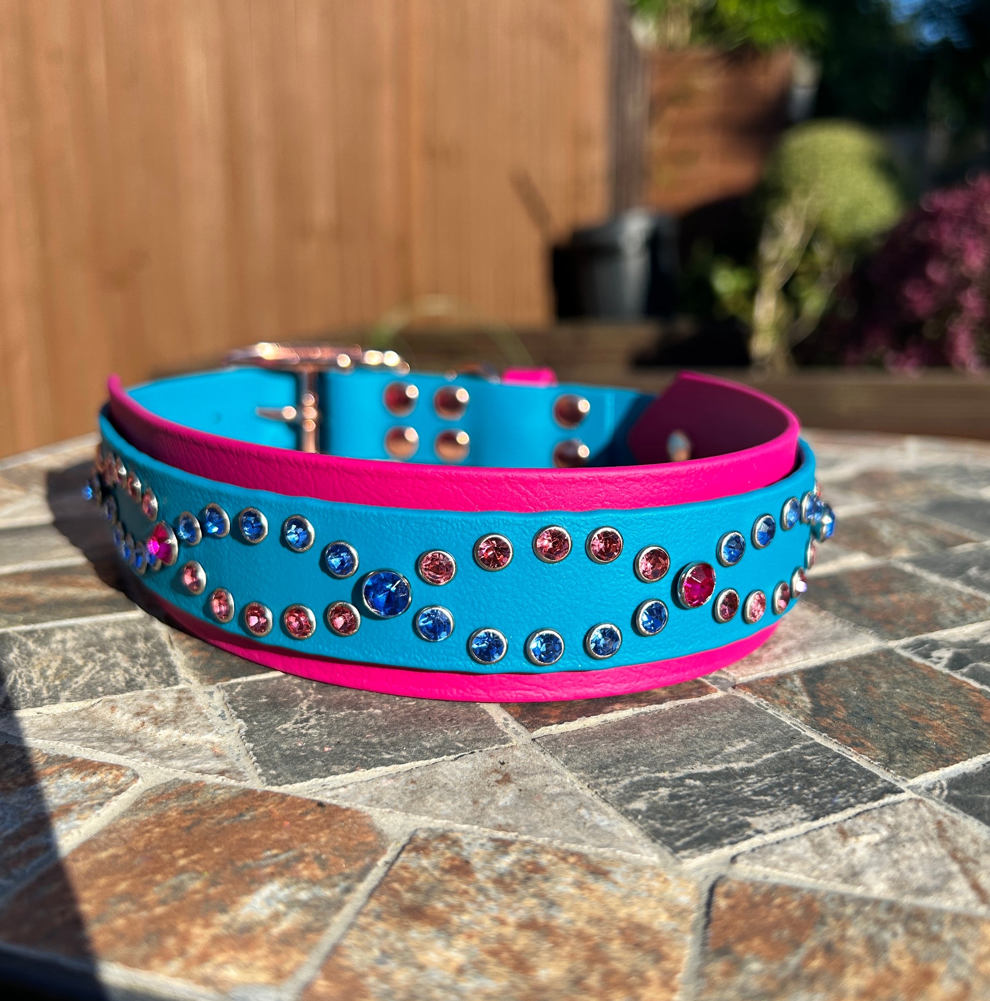 Featuring a 38mm-wide backing for comfort and a 25mm-wide wrap-around strap for added style, this design is both sturdy and elegant. The real showstopper? Dazzling diamanté rivets arranged in a graceful wave pattern, adding just the right amount of sparkle to your pup’s look.